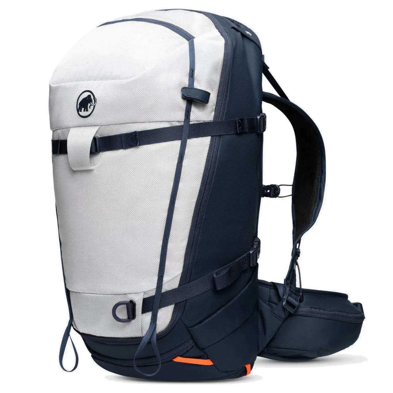 Ski touring the way it was meant to be: the Mammut women’s Aenergy ST 32 is lightweight, compact and offers plenty of room for all your equipment on longer ski touring adventures. The aluminum frame optimizes load distribution. An elastic chest strap ensures a firm fit while still allowing you to breathe easily. The all-around zipper lets you open up the main compartment completely, so you have everything instantly at your fingertips. A separate inner compartment is provided for your avalanche safety equipment. To top it all off, this all-rounder features an integrated helmet holder, rope attachment, straps for skis or snowboard, and loops for your ice axe and poles.