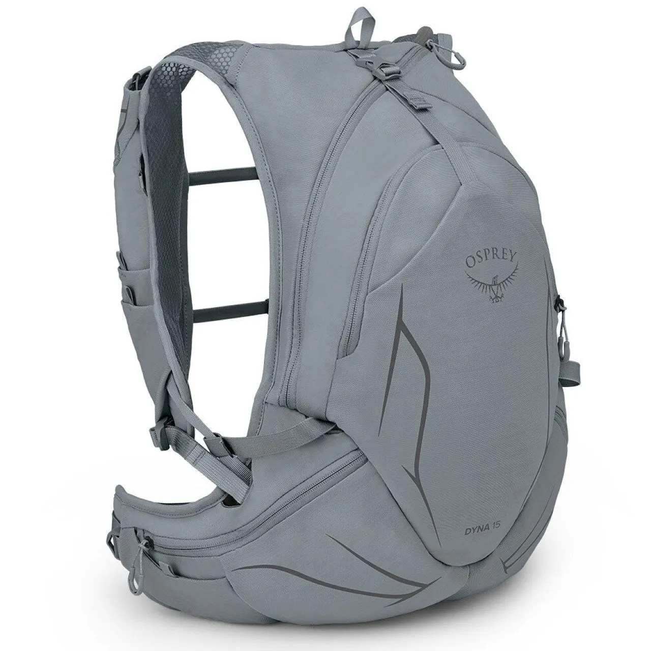 With its 2.5-liter reservoir and ample room for food and gear, yet a slim and stable design, the Dyna 15 was designed to push the limits of what marathoners and ultra-runners are capable of. Hip and harness pockets are ergonomically located to give you easy on-the-move access to your snacks, supplements and gear without sacrificing your pace. Made with 100% recycled materials.